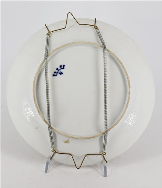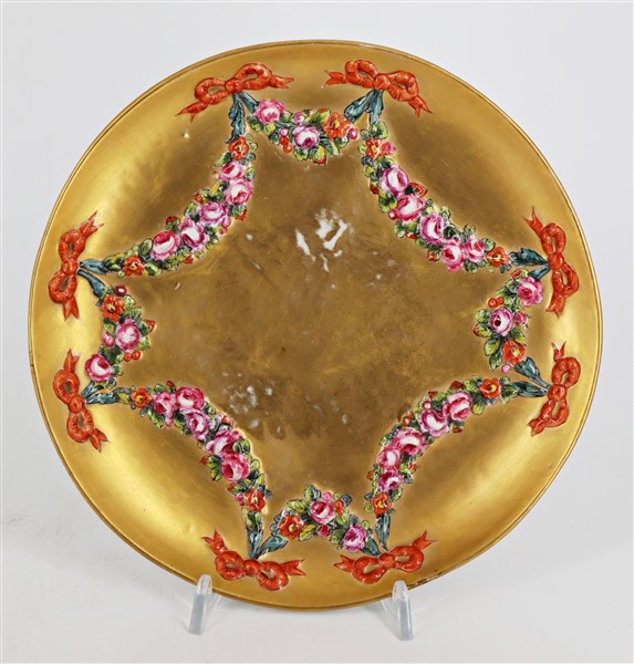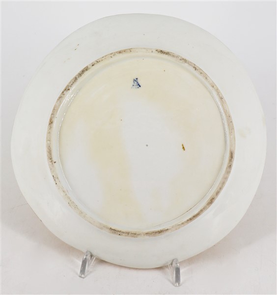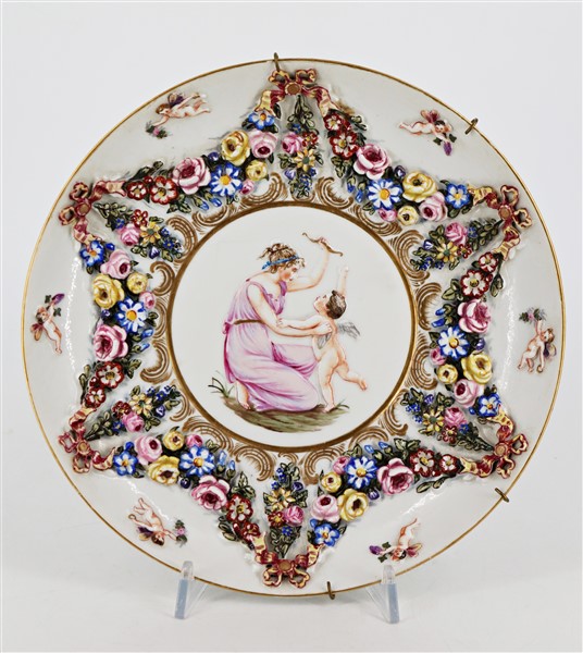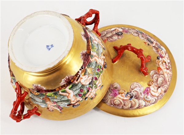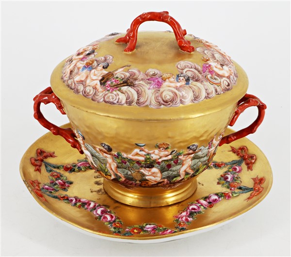 Manifatture diverse, secolo XIX-XX. Lotto composto da una tazza da puerpera con coperchio e piatto in porcellana decorata con figure a rilievo dipinte in policromia su fondo oro ed un piatto di simile decoro. Marca N coronata in blu. (d max 27) (difetti e restauri)