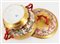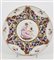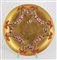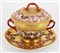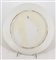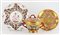 Manifatture diverse, secolo XIX-XX. Lotto composto da una tazza da puerpera con coperchio e piatto in porcellana decorata con figure a rilievo dipinte in policromia su fondo oro ed un piatto di simile decoro. Marca N coronata in blu. (d max 27) (difetti e restauri)