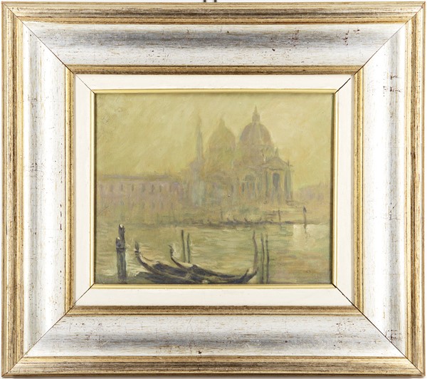 Ignoto di inizio secolo XX "Scorcio veneziano con gondole e la Basilica di San