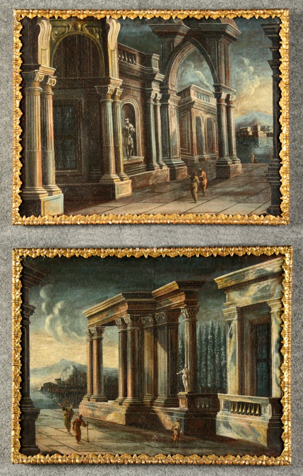 AMBITO DI ANTONIO STOM - Nato nel 1688. Morto a Venezia nel 1734. Coppia di dipinti olio su tela raff. ''ARCHITETTURE CON PERSONAGGI''. In cornice. Rintelati e rintelaiati. Mis. Lung. cm. 54 Alt. cm. 39,5 ca.