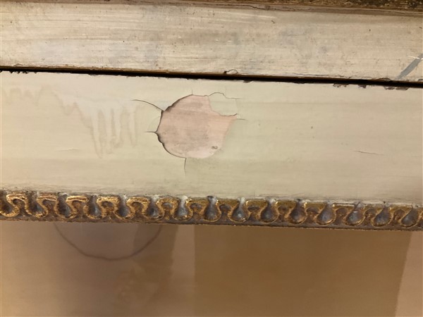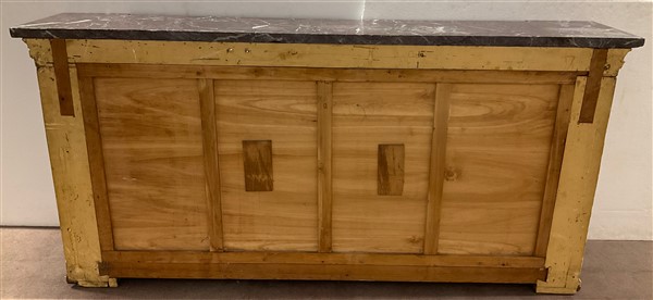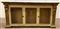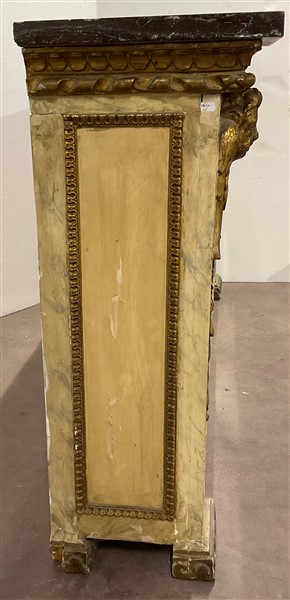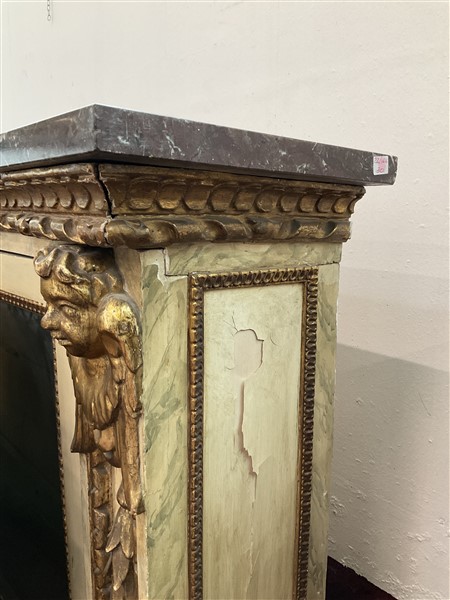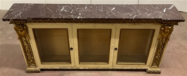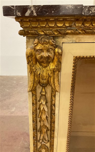 Credenza in legno laccato e dorato, fronte con tre ante a vetro, montanti intagliati a teste d'angelo su festone di foglie. Piano in marmo (cm 192,5x91,5 x 35) (difetti)