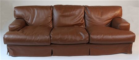 Divano a tre posti imbottito e rivestito in pelle marrone. Italia, anni '70. (cm 225x73x92) (lievi difetti)