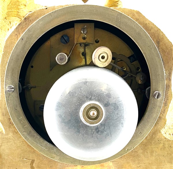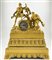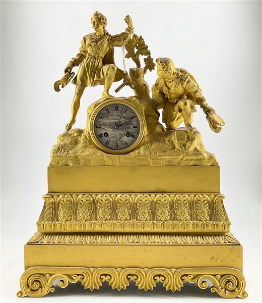 Pendola in bronzo dorato con cassa a soggetto cortese. Struttura con base a plinto con profili decorati a foglie, palmette e volute. Quadrante argentato a decoro guilloché con numeri romani e lancette del tipo "Breguet". Movimento a due treni con suoneria delle ore e mezze su campanello. Francia, secondo quarto del XIX secolo (cm 45x32,5x11) (lievi difetti)