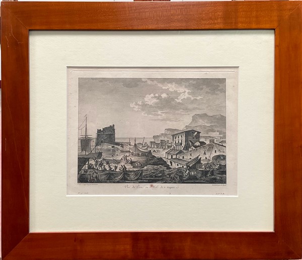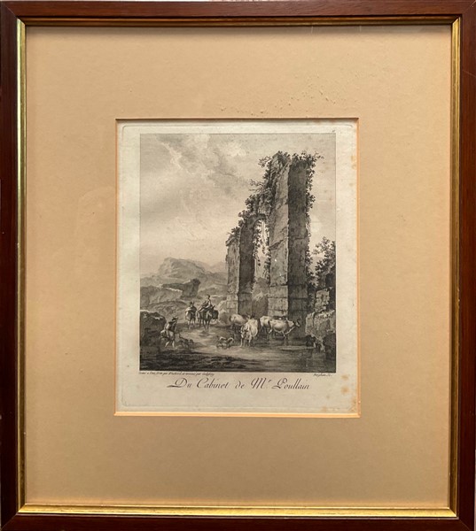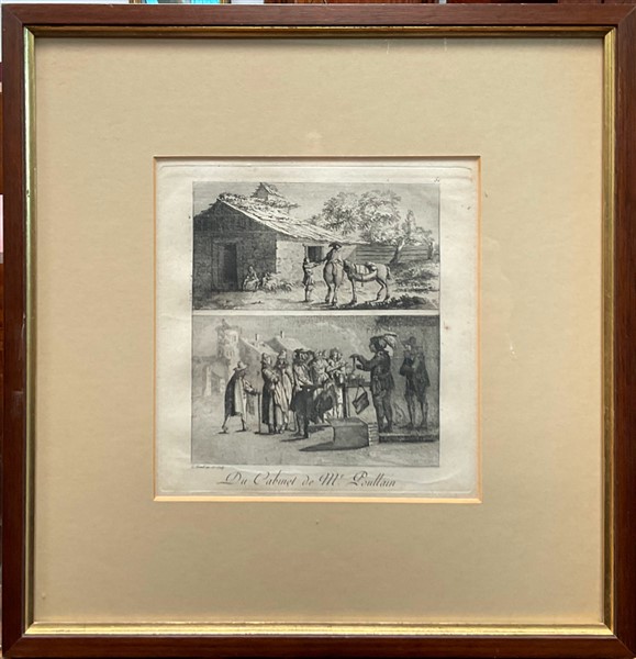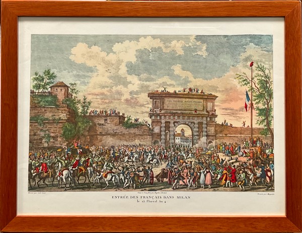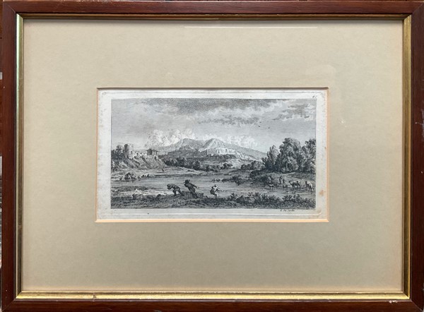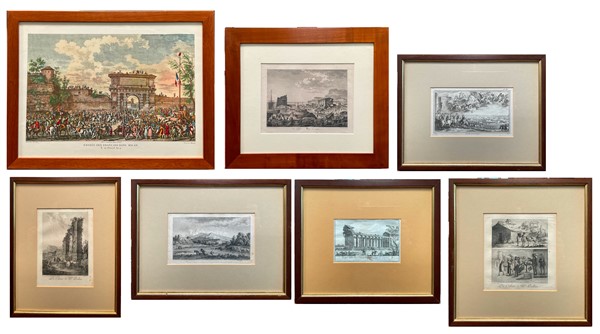 Lotto composto da sette tra cui diverse acqueforti di epoca e misure differenti raffiguranti soprattutto "Paesaggi" e una riproduzione raffigurante "l'ingresso dei francesi a Milano", in cornici. (difetti)