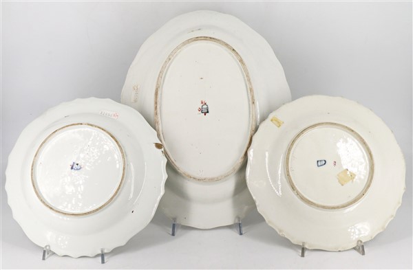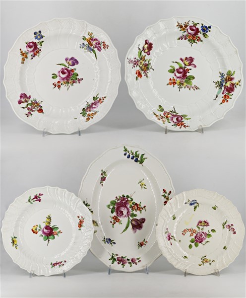 Manifattura di Vienna, secolo XVIII-XIX. Lotto composto da due grandi piatti e due fondine in porcellana con bordo a graticcio ed un vassoio ovale dipinti in policromia a fiori sparsi (cm max 27x28) (difetti e alcuni restauri)