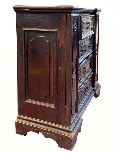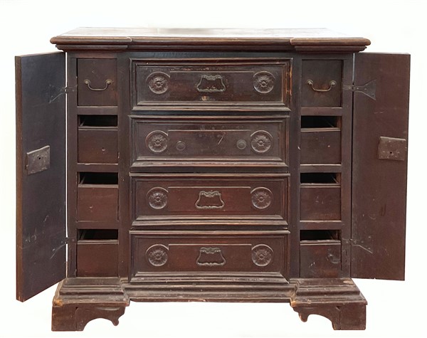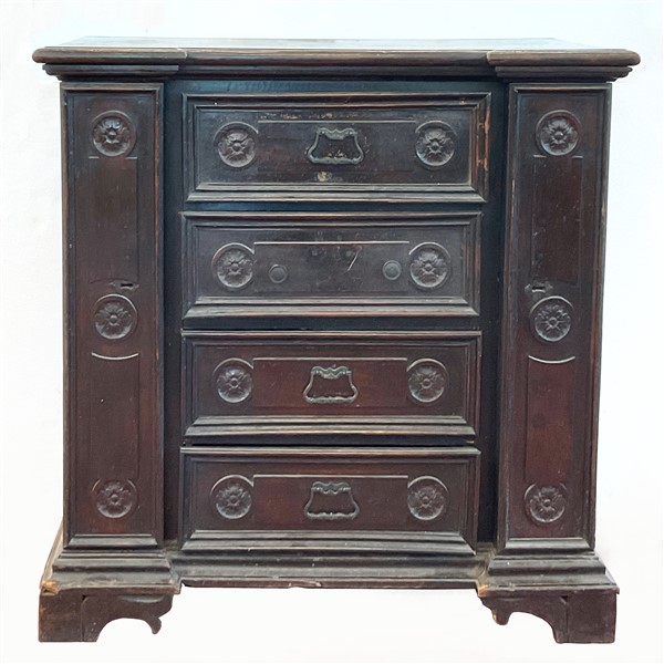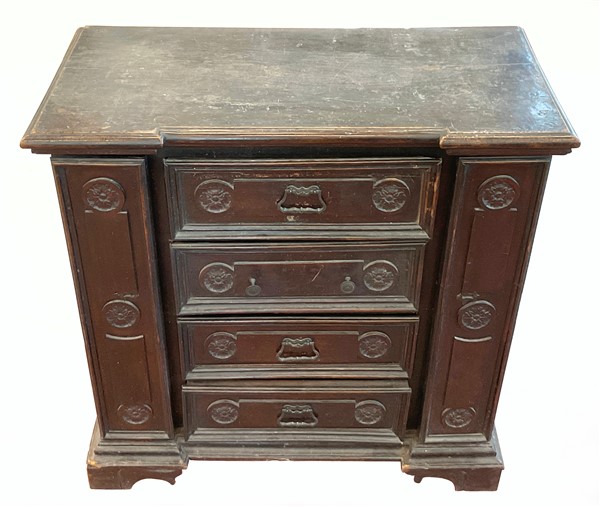 Antica cassettiera con fronte a quattro cassetti e lesene incernierate celanti otto tiretti, decori a piccoli rosoni intagliati entro riserva (cm 114x110x48) (difetti)