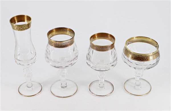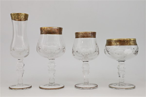 Servizio di bicchieri in vetro molato con bordure dorate composto da dodici calici d'acqua, dodici da vino, dodici coppe e dodici flute (h max cm 21,5) (lievi difetti)