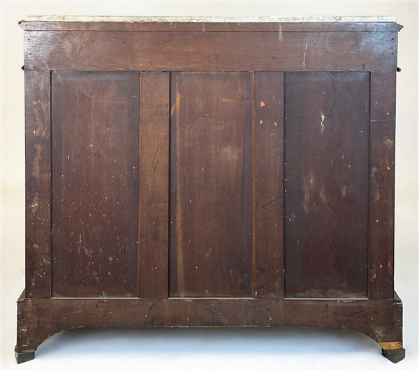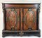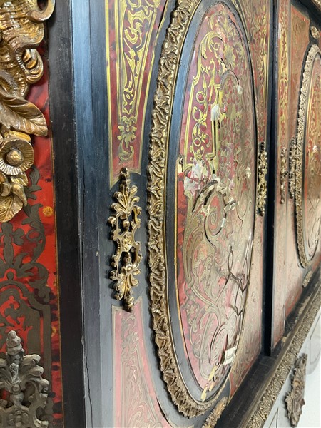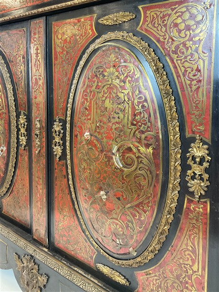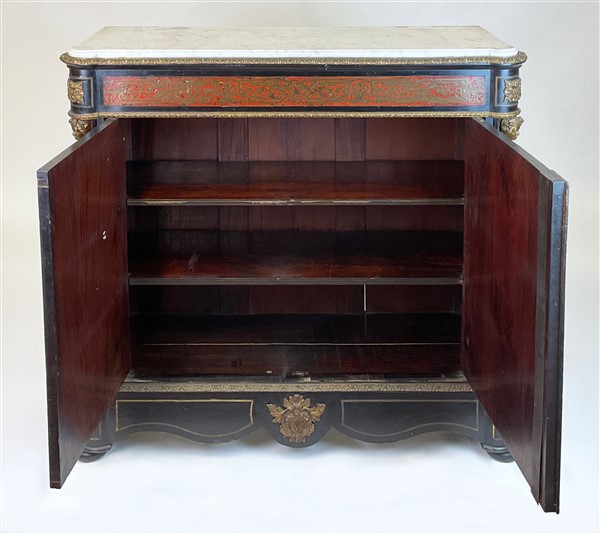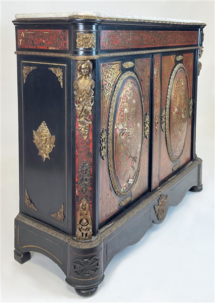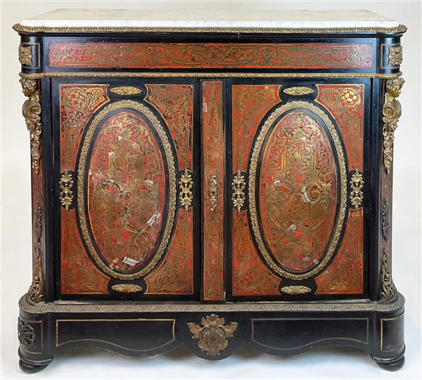 Credenza a due ante interamente intarsiata in ottone su fondo in tartaruga e legno ebanizzato nei modi Boulle, fregi e bordure in metallo dorato a volti muliebri e ovoli. Piano sagomato in marmo. Secolo XIX (cm 128x110x41,5) (difetti)