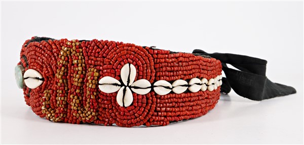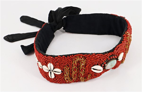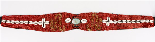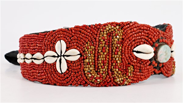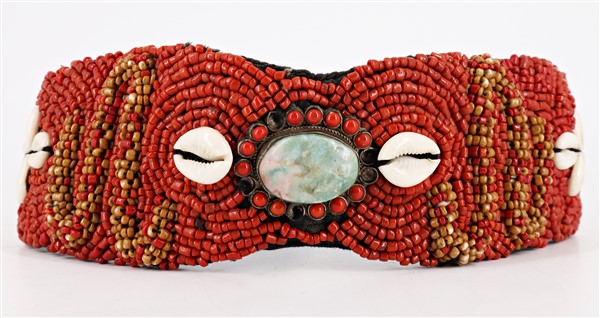 Cintura etnica composto da conchiglie, cabochon in pietra dura e perline a finto corallo su tessuto (L. cm 60) (difetti)