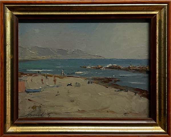 "S. Remo - Mattino d'inverno" (1955) olio su masonite (cm 17x22) firmato in basso a sinistra; etichetta al retro della galleria d'Arte Internazionale, Milano