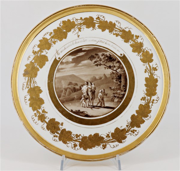 Manifattura P. L. Dagoty, Parigi, inizio secolo XIX. Vassoio circolare in porcellana decorato "en grisaille" entro riserva circolare a scena con figure entro paesaggio, bordura a ghirlanda di tralci d'uva e iscrizione in oro (d cm 30) (lievi difetti)