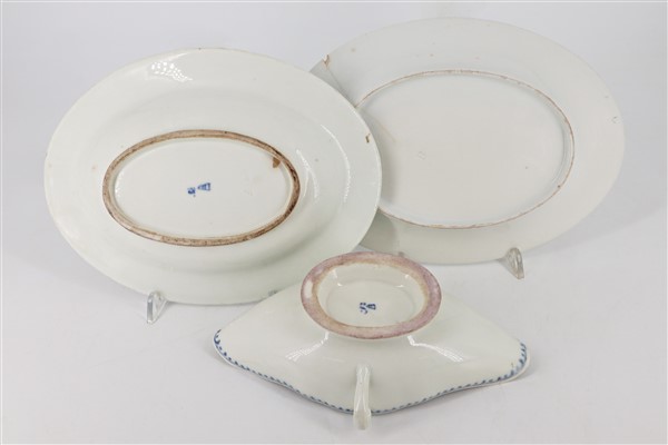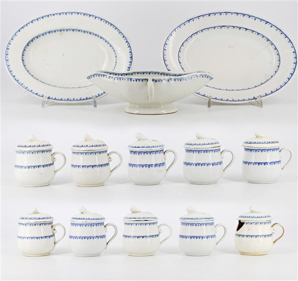 Manifattura di Vienna, secolo XIX. Lotto composto da dieci cremiere con coperchio, due piccoli vassoi ovali e una salsiera bivalve biansata in porcellana decorata a motivi stilizzati in blu (difetti e alcuni pezzi con restauri)