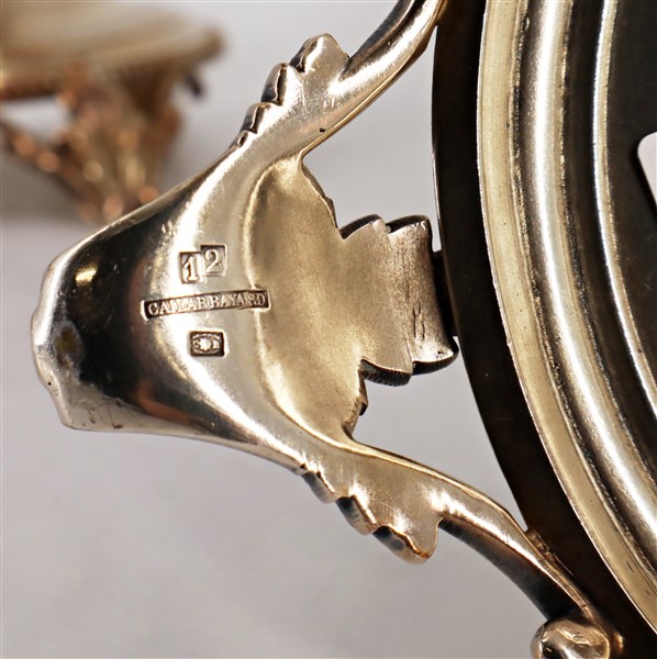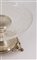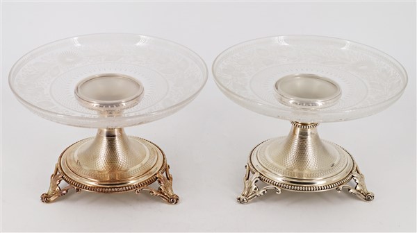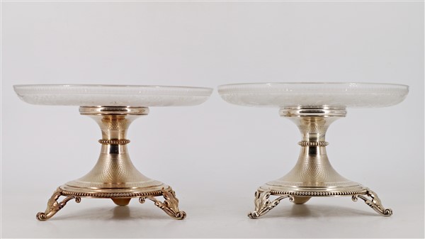Manifattura Cailard Bayard, inizio secolo XX. Coppia di alzate in cristallo inciso con decoro floreale e base circolare incisa e perlinata in metallo argentato su piedi a foglia (h. cm 14, d. cm 21,5) (lievi difetti)