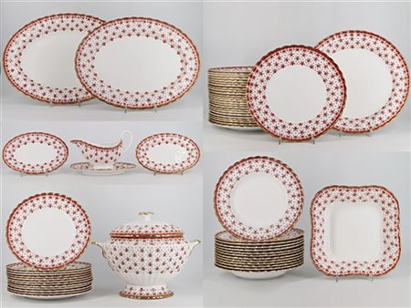 Manifattura Spode, Inghilterra, "Fleur de Lys red". Parte di servizio in porcellana bianca a bordo ondulato profilato in oro decorata in rosso a gigli. Composto da venticinque piatti piani, tredici piatti fondi, tredici piatti da frutta, tre piatti da portata, due vassoietti, una zuppiera biansata con coperchio, una ciotola quadrangolare e una salsiera. In due cartoni (lievi difetti)