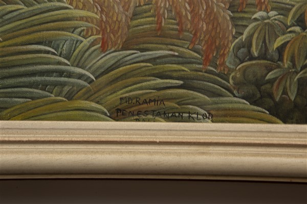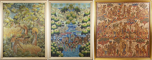Lotto composto tessuti dipinti, uno raffigurante la raccolta del riso e l'altro con una processione di figure mitologiche, uniti ad un tessuto stampato e dipinto di stile Kamasan con scene della mitologia Majapahit del secolo XIX - XX. Bali, Indonesia (cm max 91x87) In cornici (difetti)