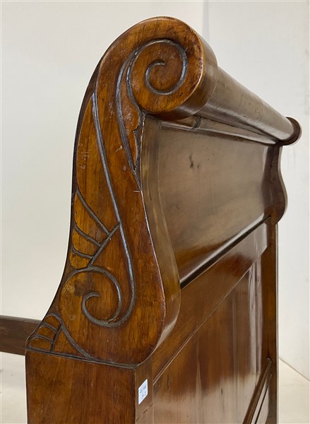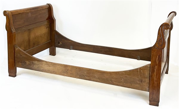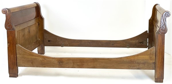 Coppia di letti a barca in noce con montanti terminanti a doppia voluta (cm 210x89,5x99,5 cad.) (difetti)