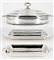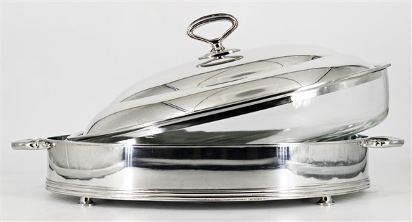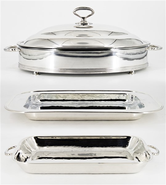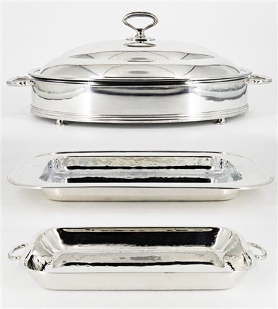 Lotto composto da una legumiera biansata in metallo argentato di forma ovale con coperchio e interno in vetro Pirex e due diversi portavivande di cui uno biansato. (cm max 49x29) (difetti)