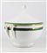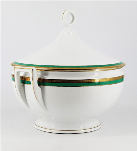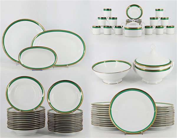 Manifattura Richard Ginori, Doccia. Servizio da tavola da dodici in porcellana bianca profilata in oro e verde composto da ventiquattro piatti piani, dodici piatti fondi, tredici piattini da frutta, una zuppiera biansata con coperchio a presa anellata, un'insalatiera, due piatti da portata, un vassoietto, una zuccheriera, dodici tazzine con piattini. In due cartoni (lievi difetti)
