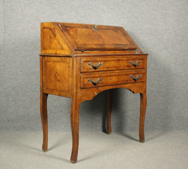 Ribaltina lastronata in legno di noce con filettature, radica di noce al centro e gambe mosse. XVIII secolo. Mis. Lung. cm. 85 Alt. cm. 104 Prof. cm. 44 ca.
