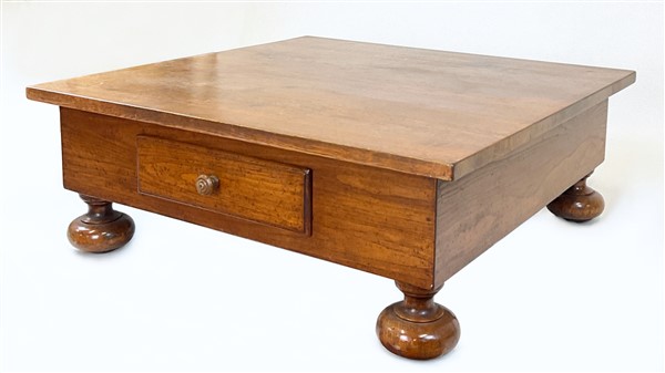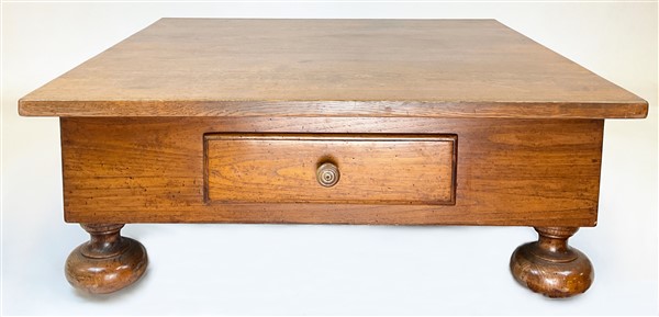 Tavolo da salotto di forma quadrata con un cassetto nella fascia e piedi a cipolla (cm 109x41x109) (difetti)