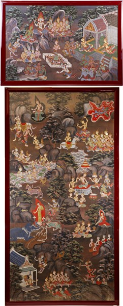 Lot 1876 | Due tessuti dipinti raffiguranti scene della mitologia tailandese con architett