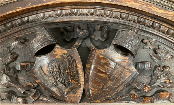Coppia di fregi da sovrapporta centinati in legno intagliato a volute fogliate e stemmi della Serenissima e del Regno di Ungheria tra nastri e rami. Veneto, secolo XIX (cm 31x101) (difetti)