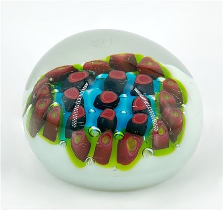 Fermacarte in vetro sommerso decorato a murrine policrome. Murano, produzione r