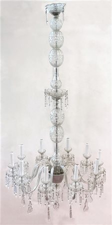Manifattura di Boemia. Lampadario a dieci luci in vetro molato con fusto e braccia decorati da pendenti sagomati e boulle (h cm 180 circa) (difetti)