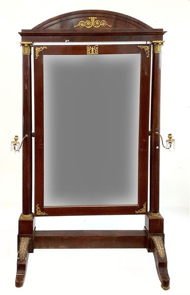 Psiche Impero in mogano con sostegni a colonna e specchio rettangolare basculante, gambe mosse decorate da foglie in legno dorato, cimasa centinata, fregi, capitelli e portacandele in bronzo e metallo dorato. Secolo XIX. (cm 122x220x69) (difetti e un piede mancante)