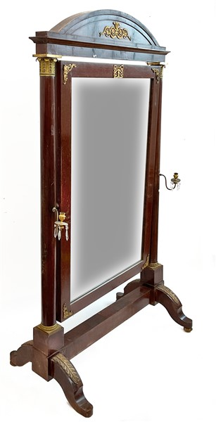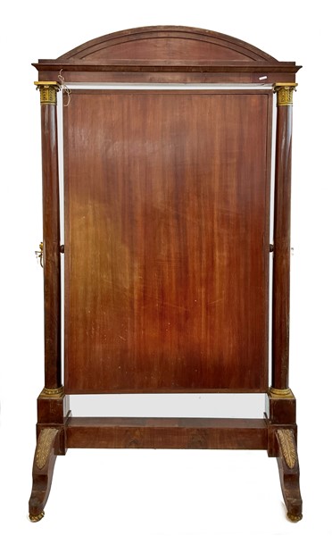 Psiche Impero in mogano con sostegni a colonna e specchio rettangolare basculan