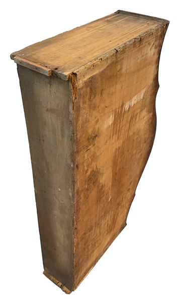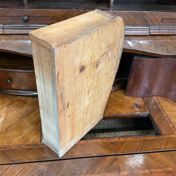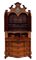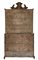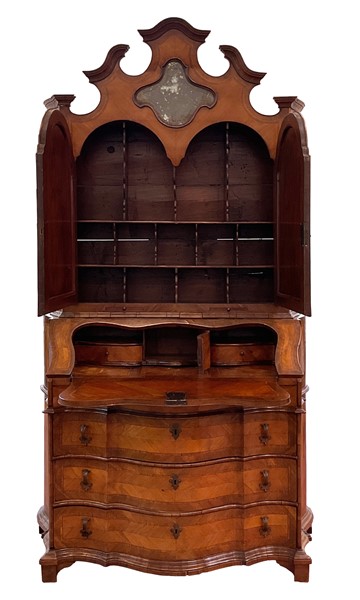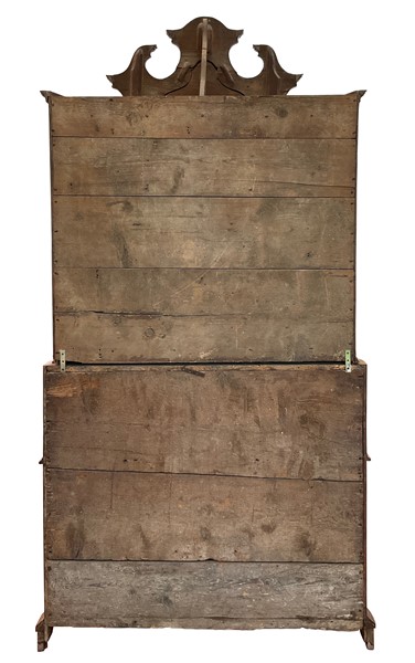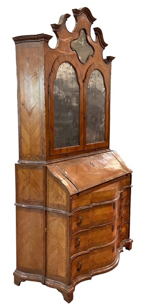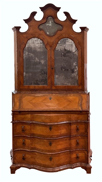 Trumeau di linea spezzata lastronato e filettato in legni vari. Parte superiore con due ante a vetri, cimasa a timpano spezzato centrata da cartella con specchio. Parte inferiore con calatoia che rivela due tiretti, vani e anta centrale, tre cassetti sul fronte, piedi a mensola. Emilia ? secolo XVIII (cm 133x262x68) (difetti, mancanze e restauri)