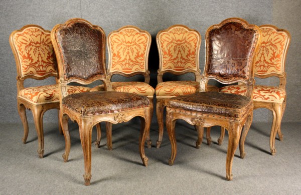 Sei sedie lombarde in legno di noce con schienale e seduta imbottita. Periodo Luigi XV. Difetti. Mis. Lung. cm. 48 Alt. cm. 100 Prof. cm. 48 ca.