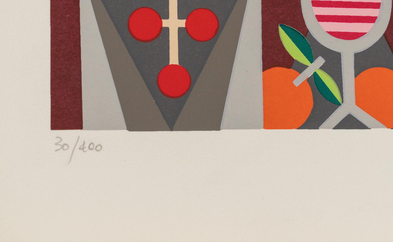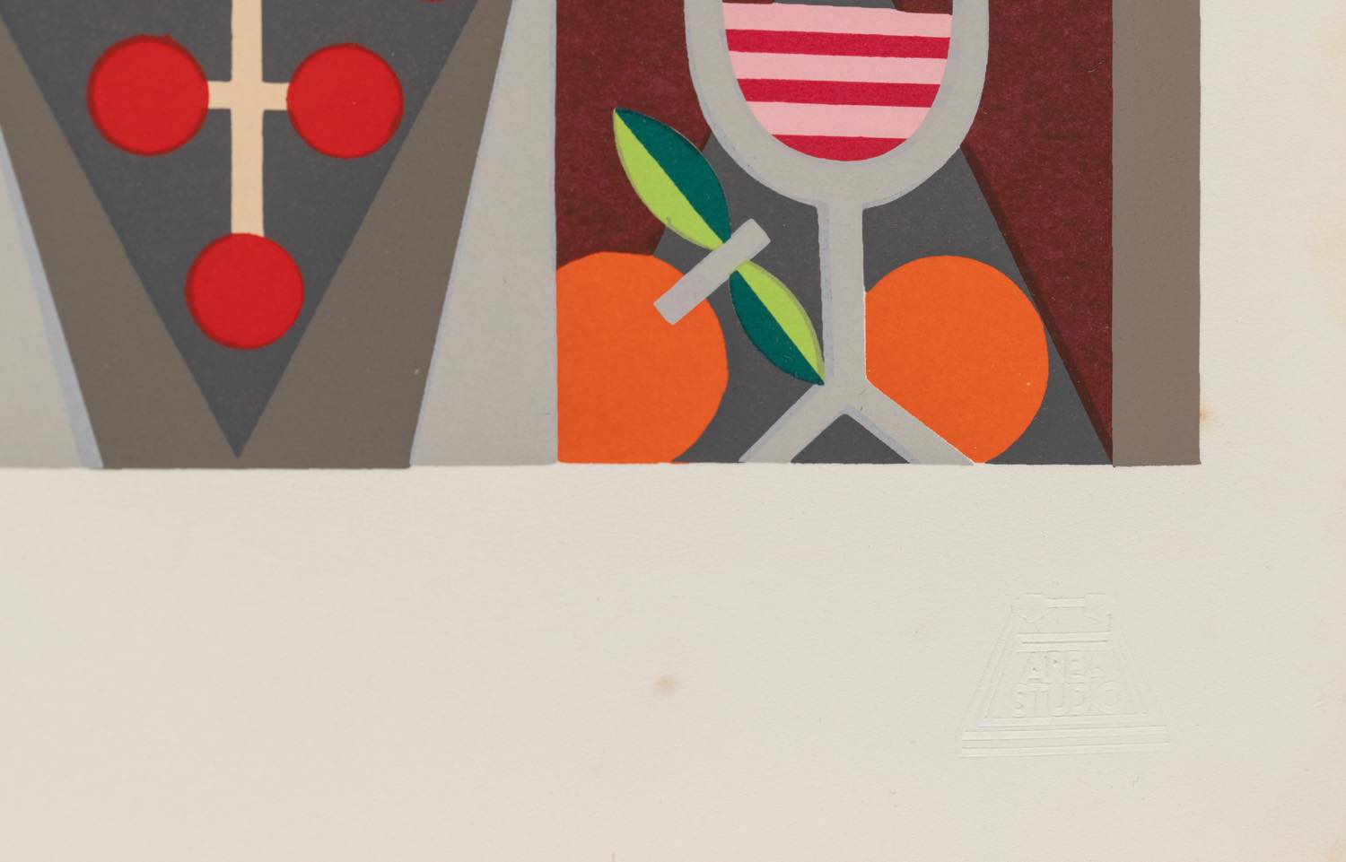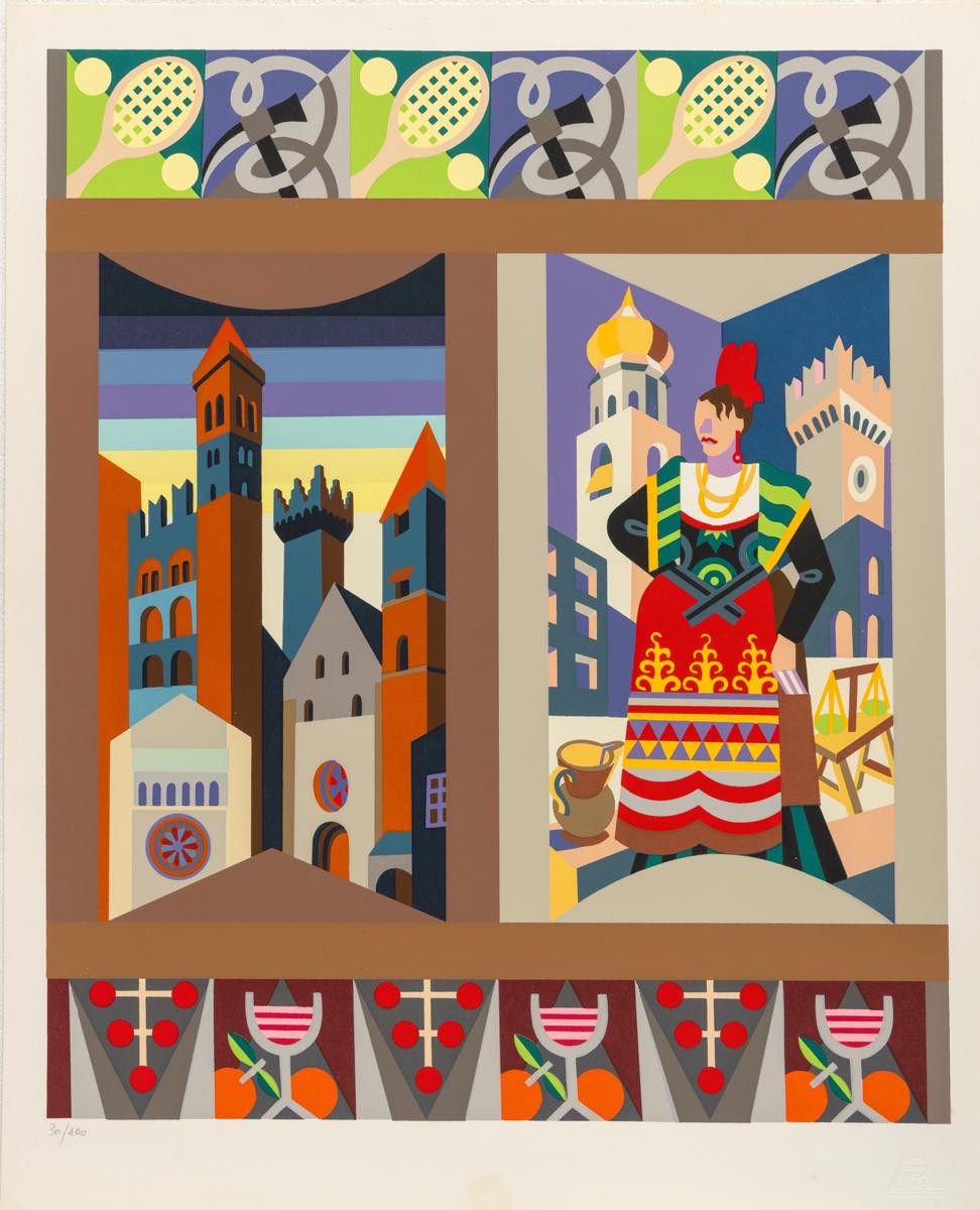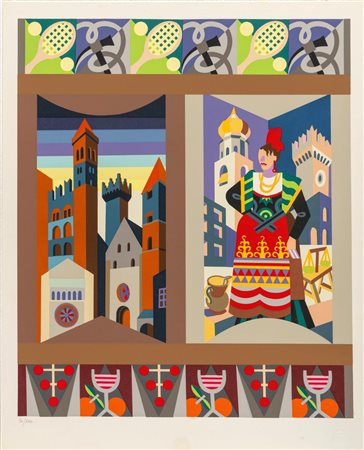 Fortunato Depero (Fondo 1892 - Rovereto 1960), “Torri di Trento”.Litografia a colori su carta, reca in basso a sinistra numero di tiratura 30/400 e in basso a destra timbro a secco Area Studio, Lastra H cm 49x41