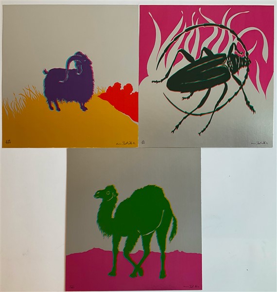 Gino Marotta "Muflone - Dromedario - Scarabeo" 1974 tre serigrafie su cartoncino