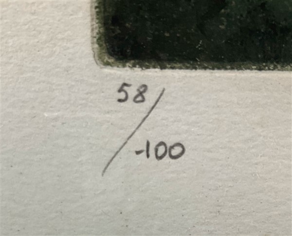 firmata e numerata 58/100 in basso a matita, timbro a secco Galleria dell'Incisione, Milano in basso a sinistra. In cornice (difetti)