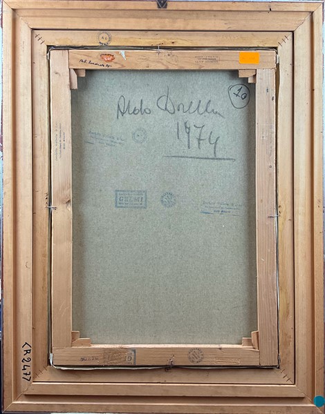 firmato in basso a destra; firmato e datato e timbri di gallerie al retro. In cornice (difetti)