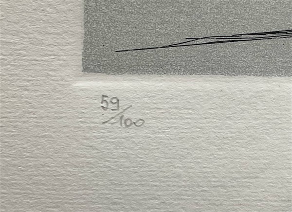 firmata e numerata 59/100 in basso a matita, timbro a secco Torcular, Milano in basso a sinistra. In cornice (lievi difetti)