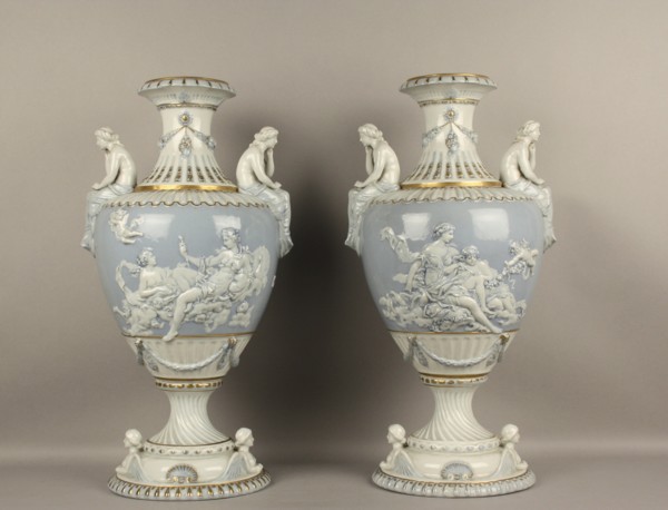 Coppia di vasi in porcellana bianca e azzurra a rilievo. Marcati sotto la base. Inizi XX secolo. Mis. Alt. cm. 42 ca.
