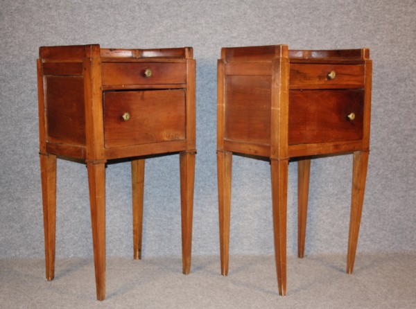 Coppia di comodini Luigi XVI in legno di noce. Difetti e restauri. Mis. Lung. cm. 47 Alt. cm. 89 Prof. cm. 35 ca.