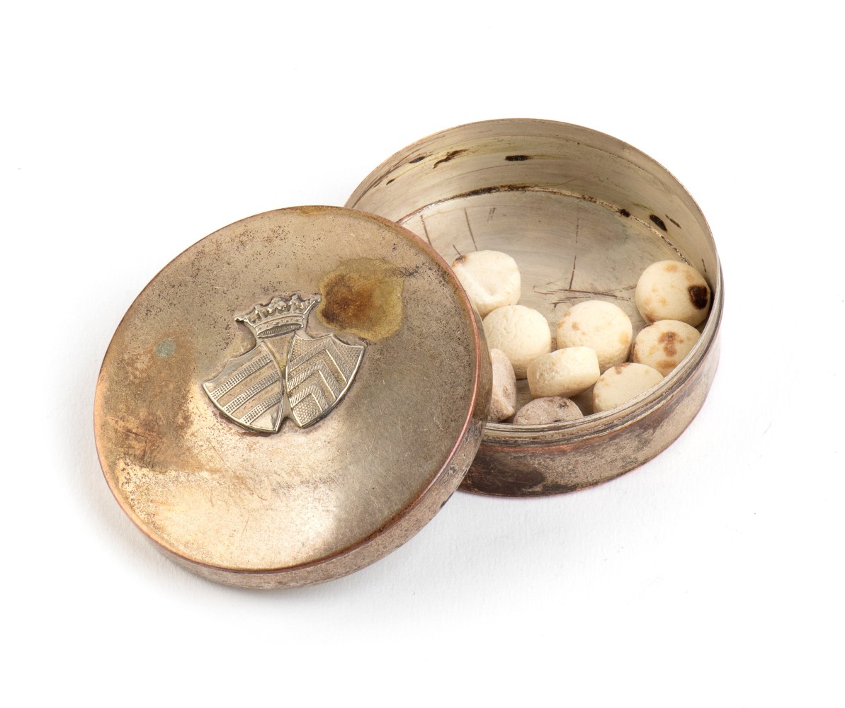 Bel portapillole in argento punzonato con piccoli stemmi nobiliari applicati, in ottimo stato, appartenuta al Grande Ammiraglio Thaon de Revel