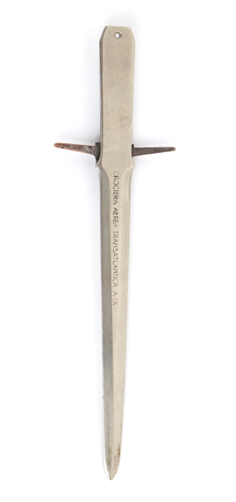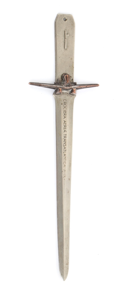 Tagliacarte in metallo commemorativo della 1a crociera aerea transatlantica, Italia-Brasile del 1931. metallo coniato con iscrizione impressa, sagoma di S.55 frontale e fascio littorio sul manico, marcato FM Lorioli e Castelli Milano, buone condizioni.