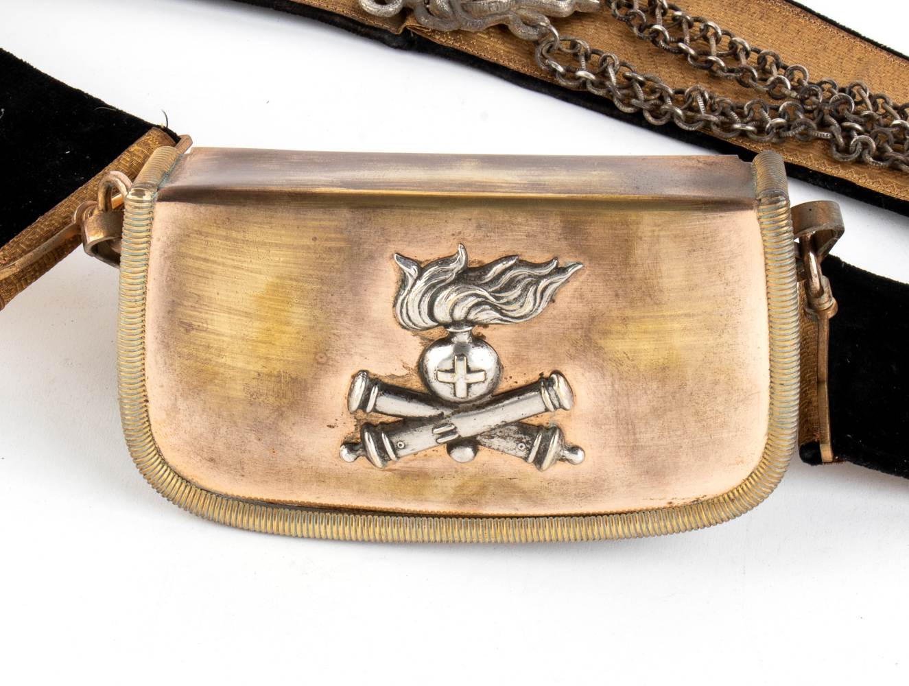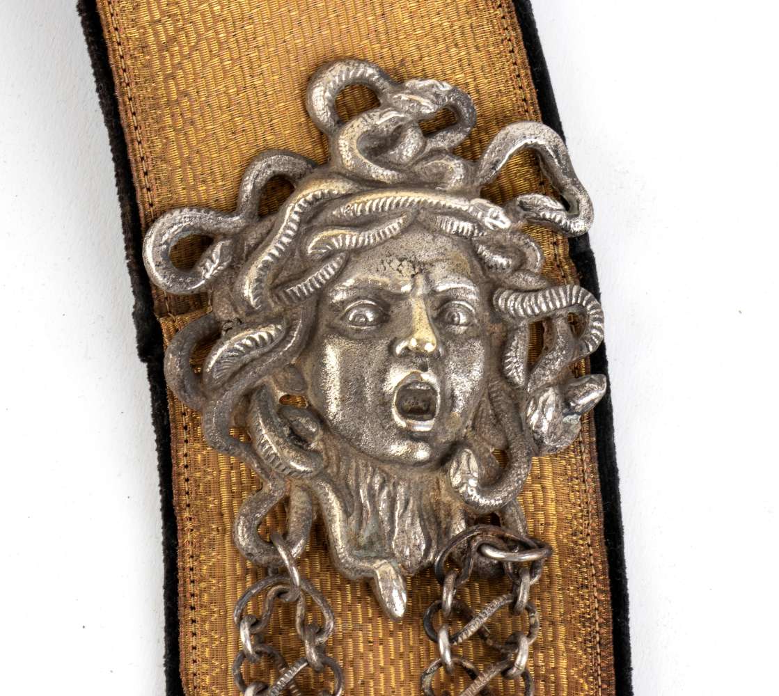 Bandoliera per alta uniforme di ufficiale di artiglieria, gallone dorato su fascia di velluto con applicata testa di medusa di ispirazione caravaggesca, giberna in metallo dorato con applicato il trofeo dell'arma di artiglieria, in ottimo stato