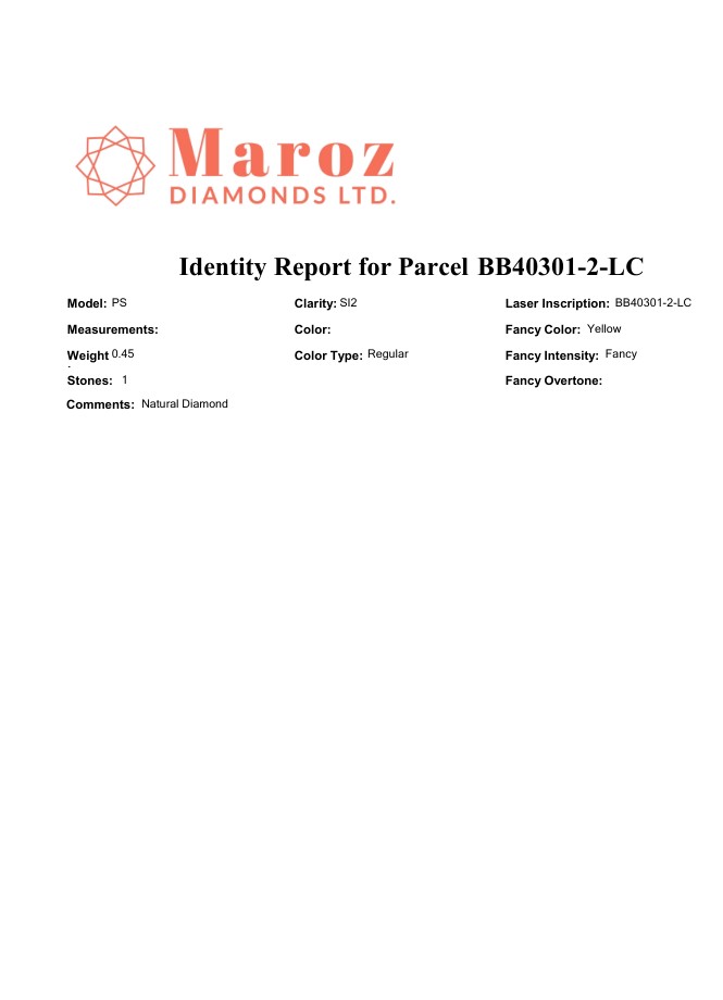 DIAMANTE FANCY COLOR 0,45 CARATI COLORE GIALLO - PUREZZA SI2 - TAGLIO PERA - CERTIFICATO GEMMOLOGICO MAROZ DIAMONDS LTD MEMBRO ISRAEL DIAMOND EXCHANGE - NUMERO INCISO AL LASER NELLA CORONA - BB40301-2-LC