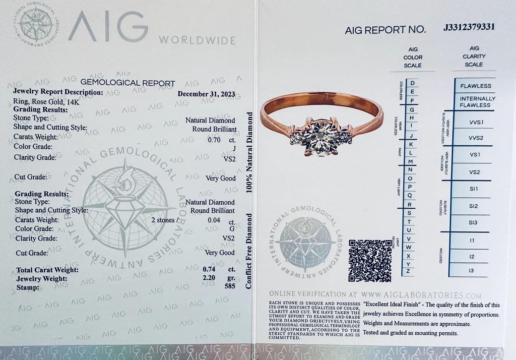 ANELLO IN ORO ROSA 14K 2.21 GR CON DIAMANTI PER 0.70 CT COLORE J PUREZZA VS2 + BRILLANTI PER 0.04 CARATI COLORE G PUREZZA VS2 TAGLIA - 8.5 CERTIFICATO AIG - RNG31203