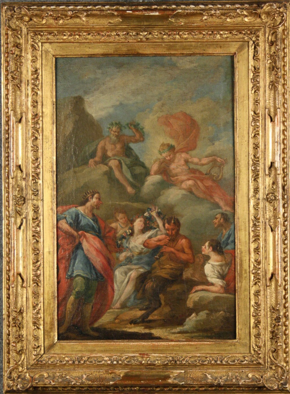 SCUOLA VENETA DEL XVIII SECOLO. Dipinto olio su tela raff. ''APOLLO E MARSIA''. In cornice dorata. Rintelato e rintelaiato. Mis. Lung. cm. 25 Alt. cm. 39,5 ca.