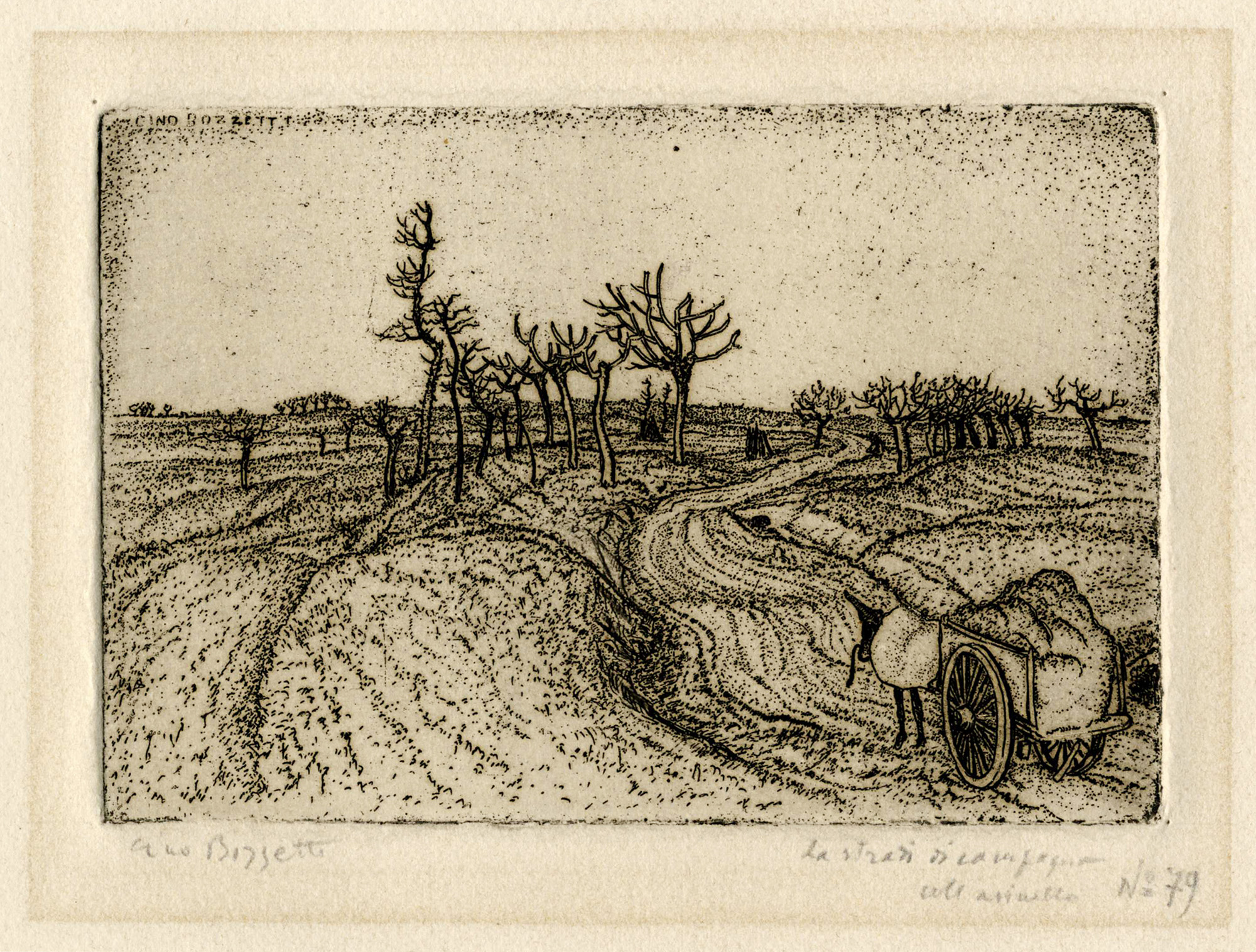 2) La strada di campagna. Acquaforte. mm 105x155. Foglio: mm 255x335. Firmata in lastra in alto a sinistra, controfirmata a matita in basso a sinistra. Titolata a matita in basso a destra.
