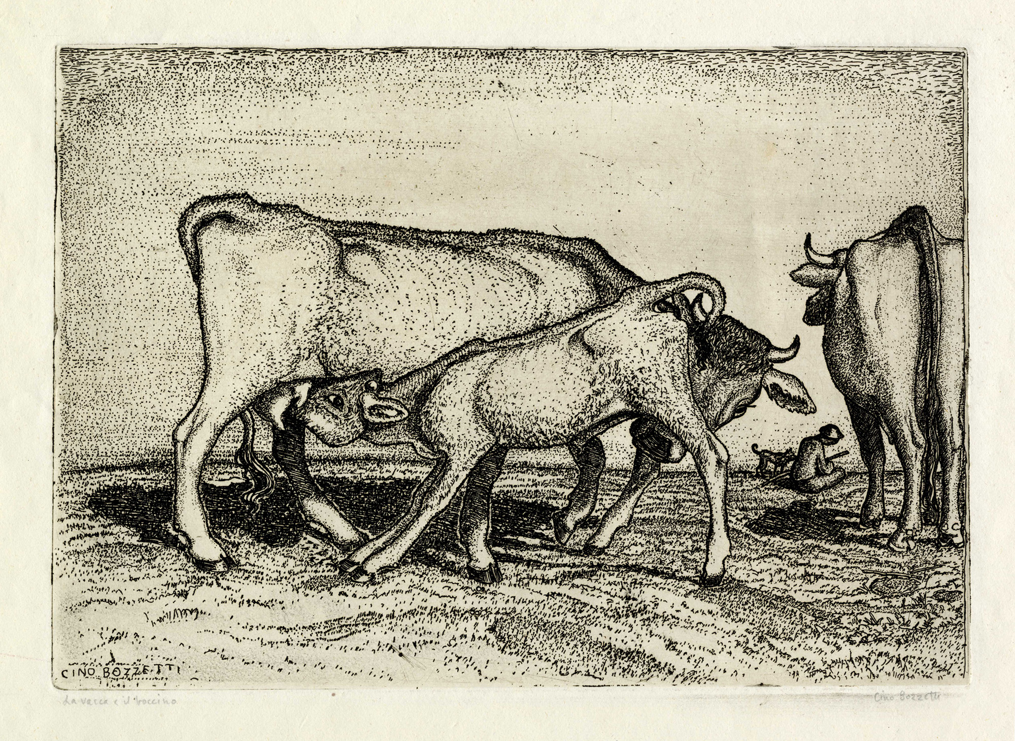 3) La vacca e il vaccino. Acquaforte. mm 205x285. Foglio: mm 265x400. Firmata in lastra in basso a sinistra, controfirmata a matita in basso a destra. Titolata a matita in basso a sinistra. Iscritto "27" in lastra al margine superiore centrale del foglio.