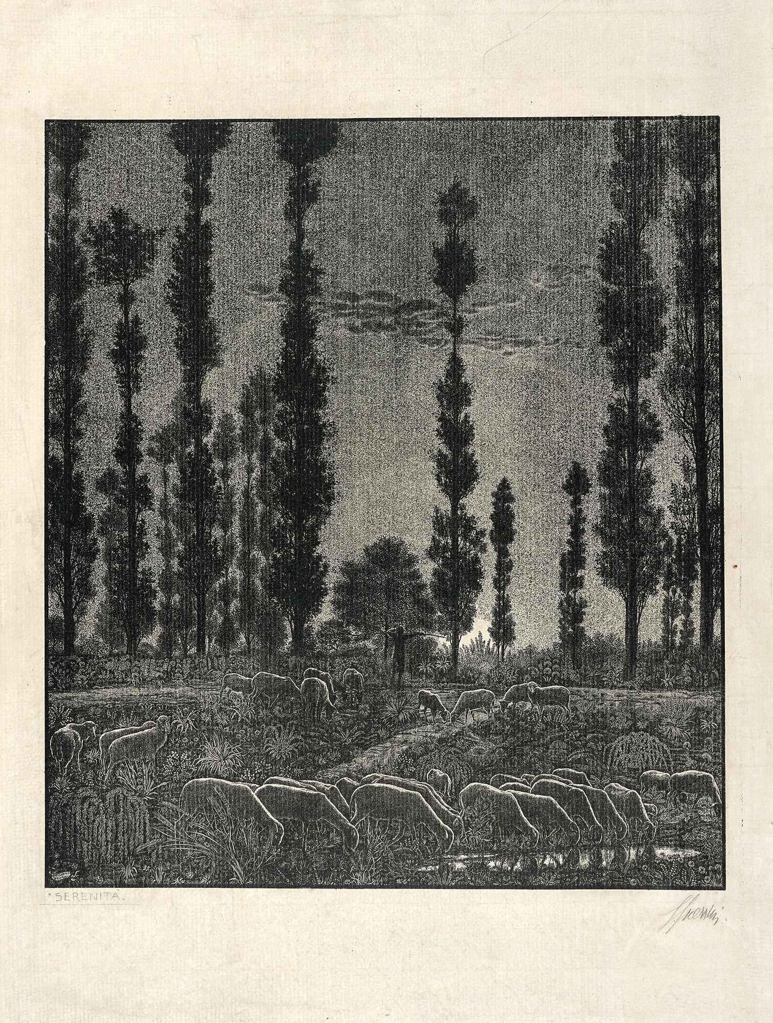 Titolata e firmata a matita sotto alla parte incisa. In entrambi i cataloghi citati la litografia Serenità viene datata al 1922, ma precisiamo che nella pietra compare la data 1919 (anche se poco leggibile).