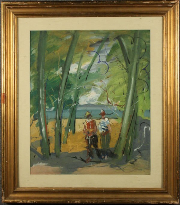 SPAZZAPAN LUIGI - Nato a Gradisca d'Isonzo (GO). Morto a Torino nel 1958. Espone a Parigi, Roma, Venezia e Milano. Dipinto olio su compensato raff. ''PAESAGGIO CON PERSONAGGI''. Sul retro i cartigli della Galleria Pogliani di Roma e della Galleria La Barcaccia di Napoli. In cornice. Mis. Lung. cm. 50 Alt. cm. 60 ca.