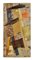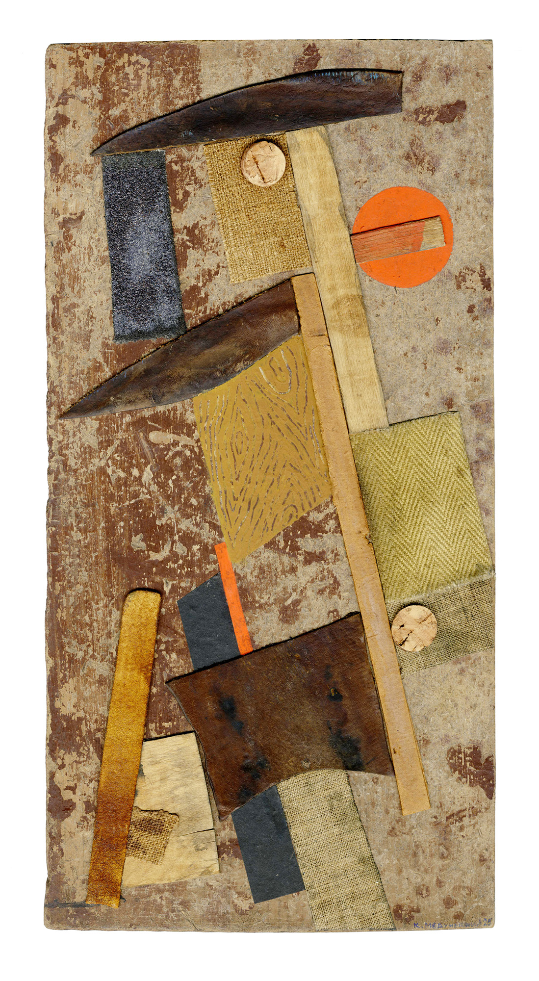 Collage di legno, tessuto, sacco e altri materiali su tavola di legno dipinta